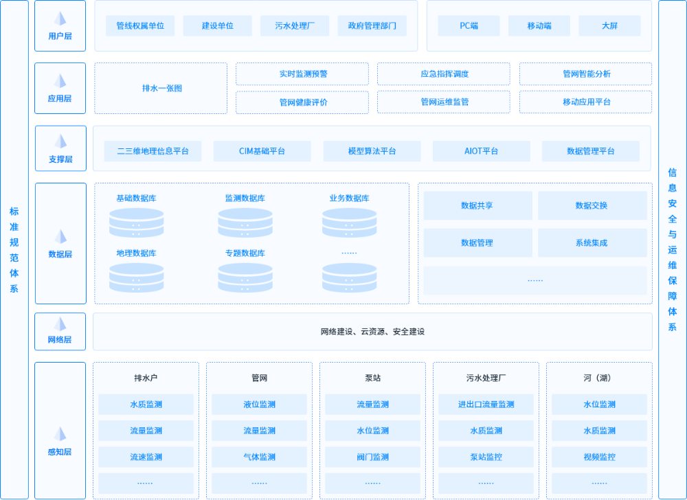 以管网数据、物联网监测数据为基础,实现剖切分析、流向分析、淤堵分析、负荷分析、内涝分析、溯源分析、爆管分析等多种分析功能,辅助管理者进行风险评估和决策。