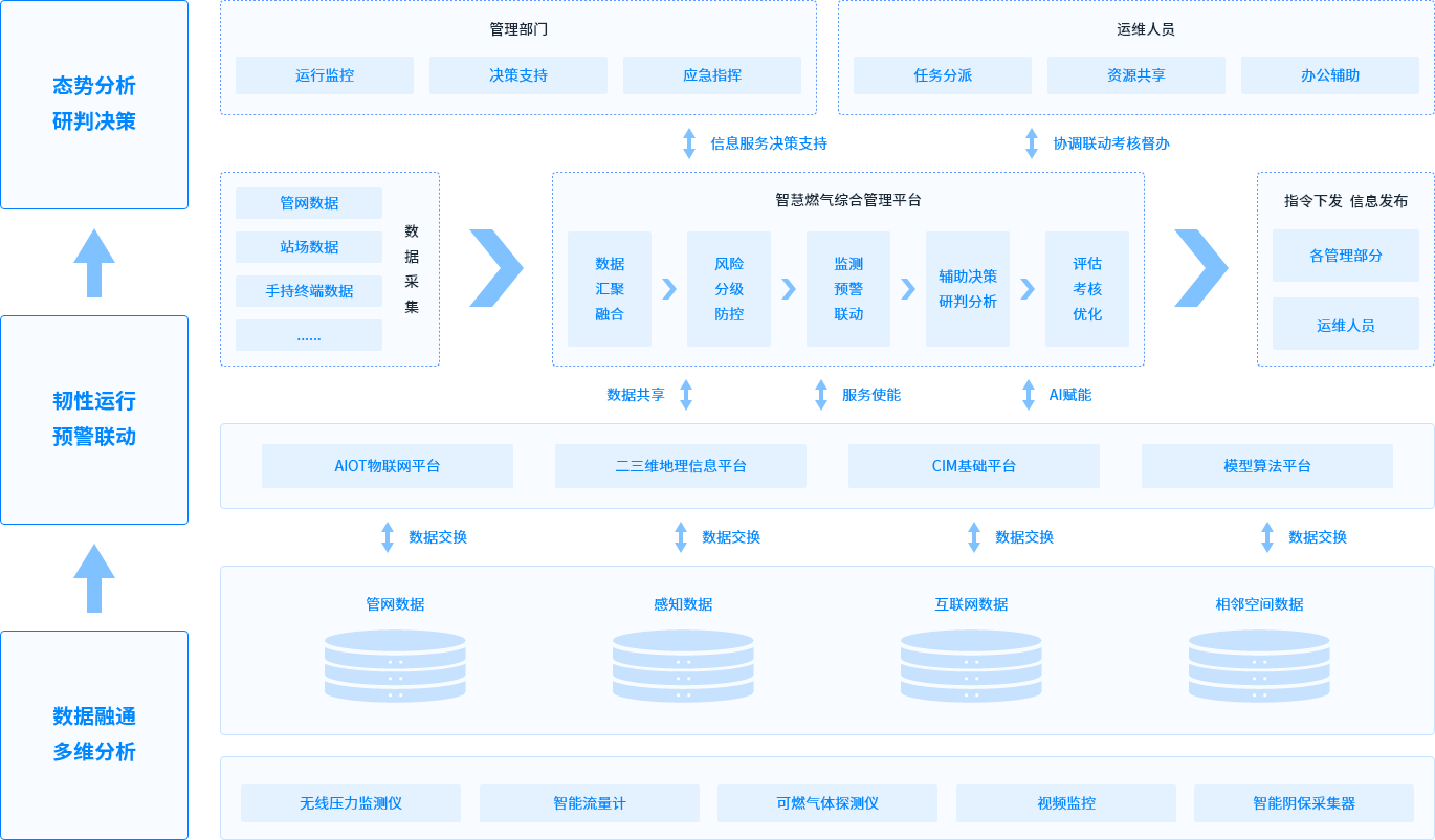 利用燃气泄漏、智能阴保、应力应变等物联网设备,实时监测燃气管网运行状态,实现燃气安全运行监管、燃气事故预警,降低燃气事故发生率。